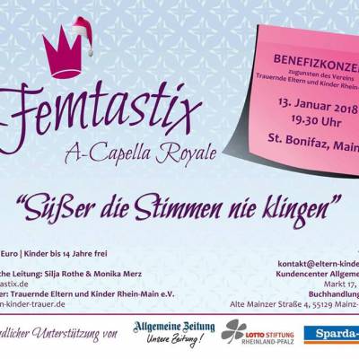 Der Verein Trauernde Eltern & Kinder Rhein Main schließt seine Feierlichkeiten zum 20-jährigen Bestehen mit einem Benefizkonzert des Frauenchores Femtastix am Samstag, 13.1.2018 um 19:30 Uhr in der Kirche St. Bonifaz, Mainz ab.