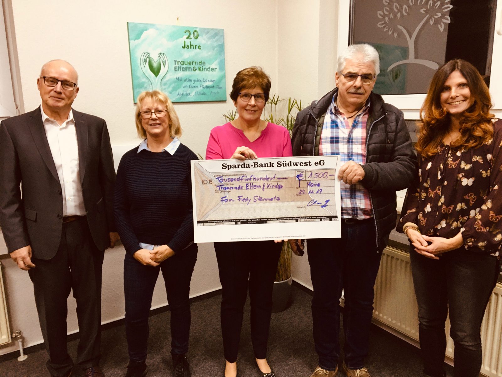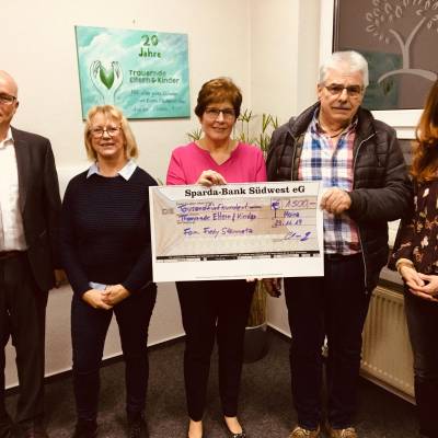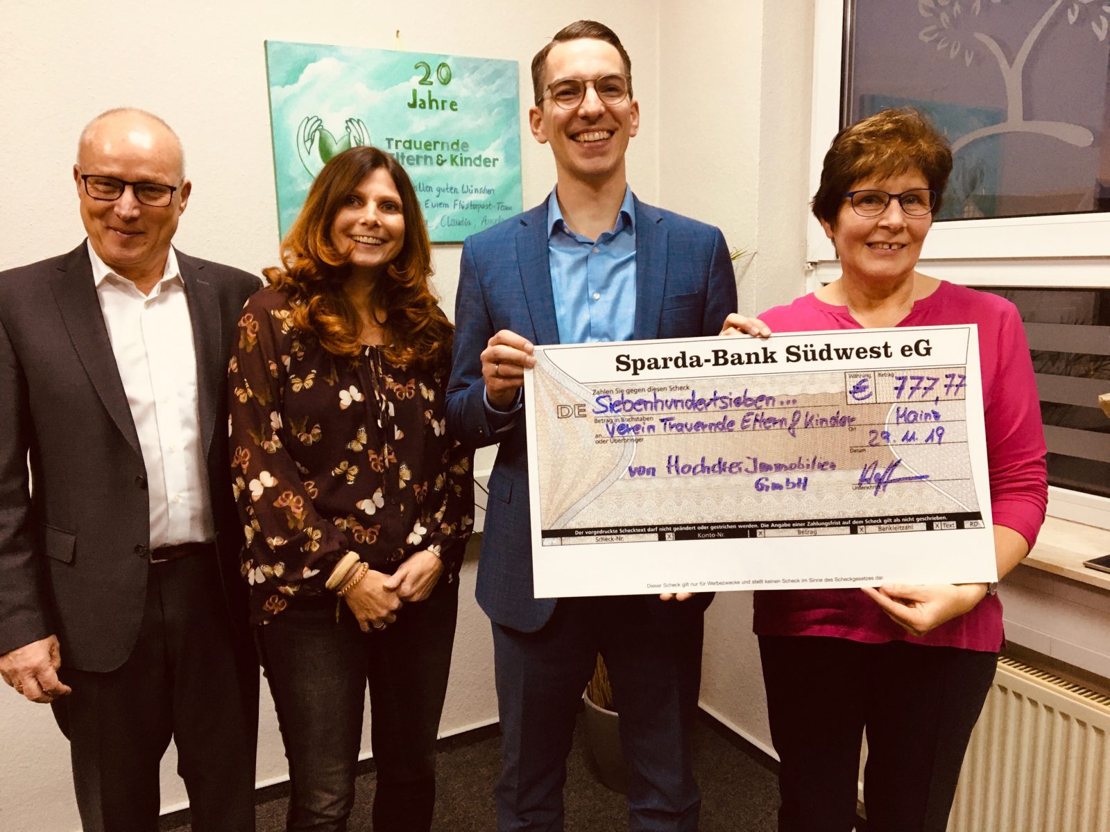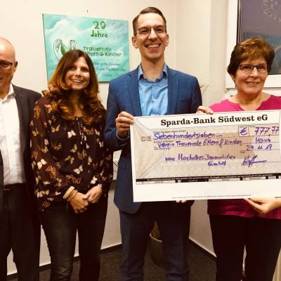 Auch Felix Hoffmann von Hochdrei Immobilien kam mit vollen Händen: Ein Spendenscheck in Höhe von 777,77 € für die wichtige Trauerarbeit des Vereins übergab er an die Vorsitzende Irene Heppel.