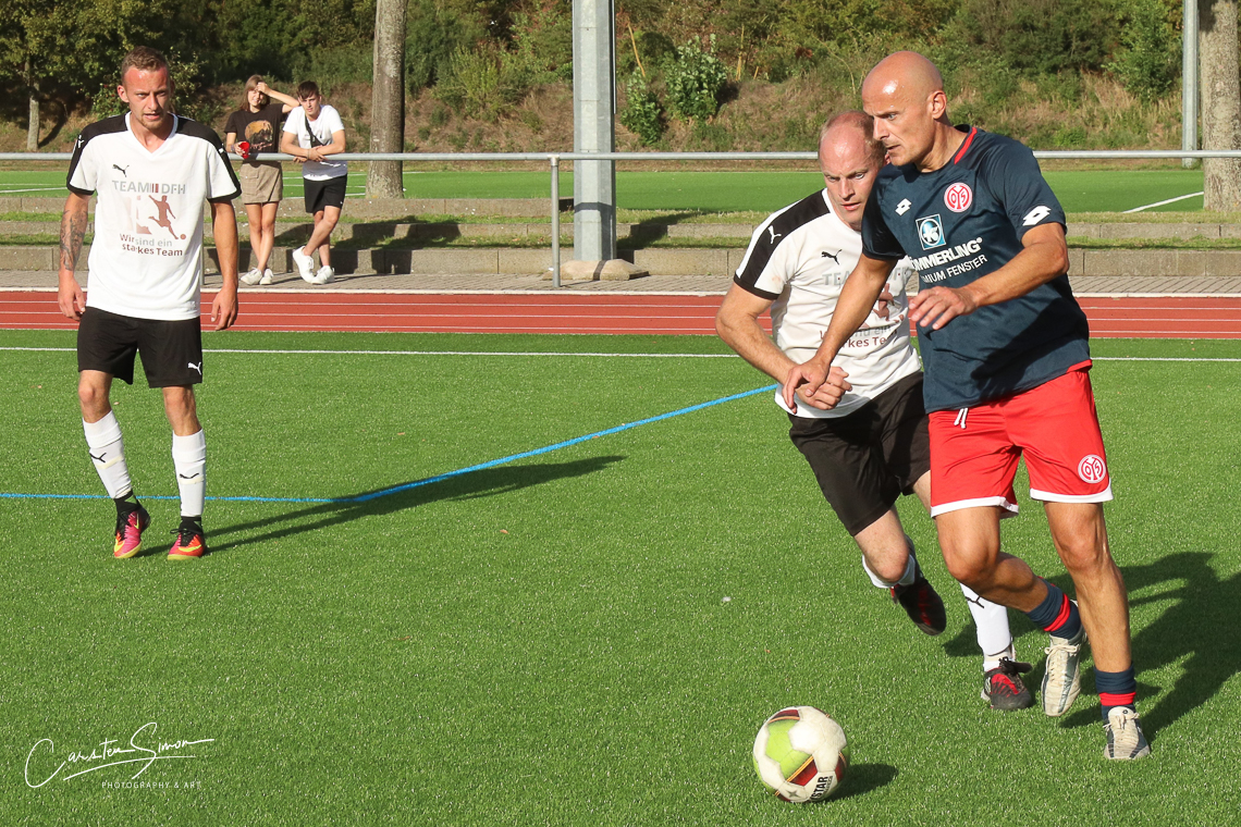 Dort sahen Künzer und die ca. 250 Besucher des Turniers, darunter auch die Bundestagsabgerordnete Ursula Groden-Kranich sowie die Mainzer OB-Kandidaten Tabea Rößner und Nino Haase, tatsächlich manche Meisterleistung gerade von den Finalisten von Mainz 05 und Deutsche Fertig-Haus Simmern sowie vom drittplazierten Team der 1817-AH oder der Deutschen Bank, die allesamt mit spielstarken Akteuren antraten. Am Ende siegte die Traditionself von Mainz 05, für die Christof Babatz als Kopf des Teams unter anderem Tamas Bodog, Srdjan Baljak, Daniel Gunkel, Mike Janz und Thomas Zampach aufs Feld schickte, im Endspiel knapp mit 4:3. „Wichtiger aber war, dass hier heute Fußball mit Spaß und ohne Grätschen im Geiste einer wichtigen Sache gespielt wurde, für die sich Trauernde Eltern & Kinder engagiert“, sagte Babatz. „Deshalb haben wir sehr gerne mitgespielt.“ Der Erfolg am Samstag war ein kleiner Trost für die 05er-Seele. Zeitgleich verloren schließlich die Profis im DFB-Pokal in Kaiserslautern.