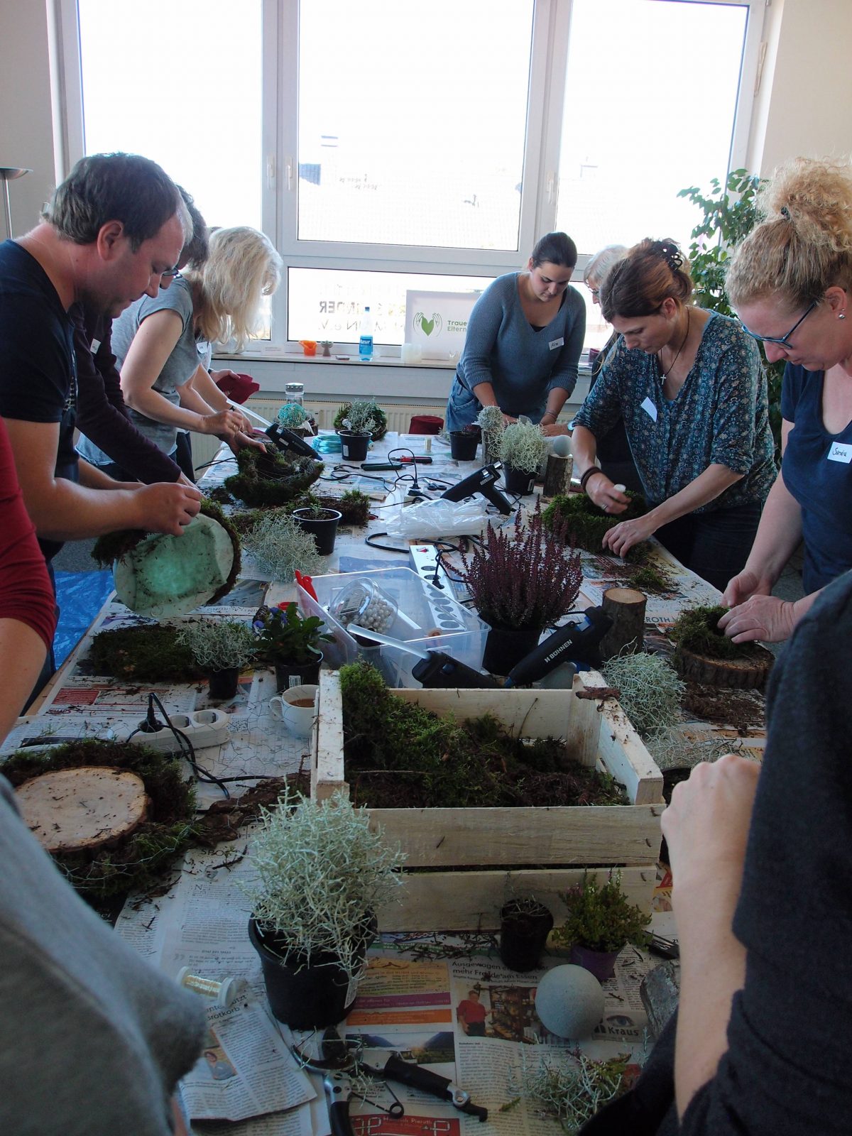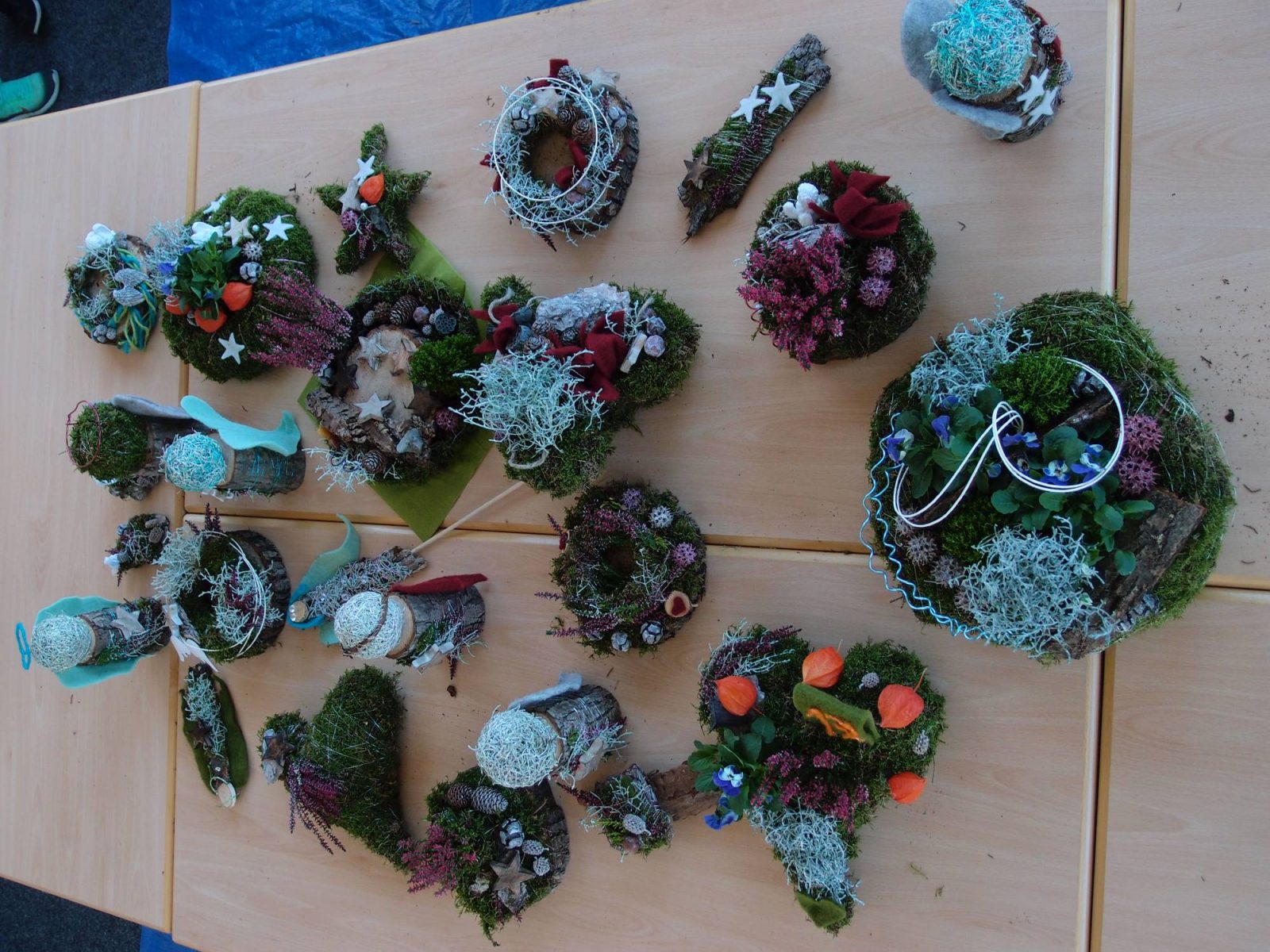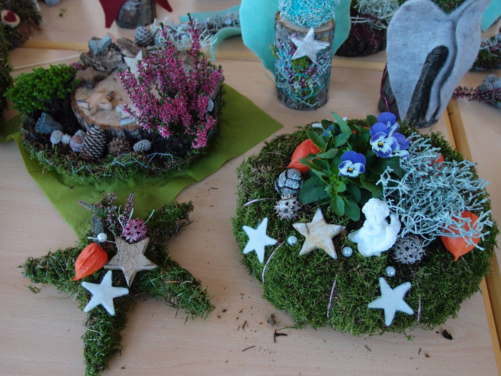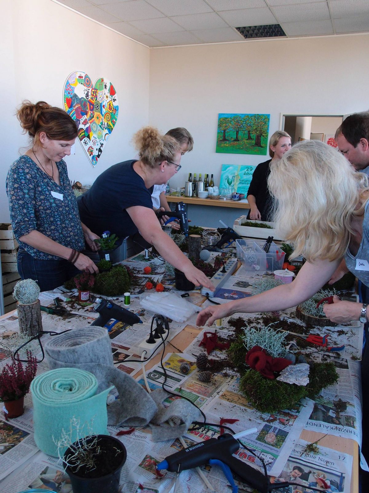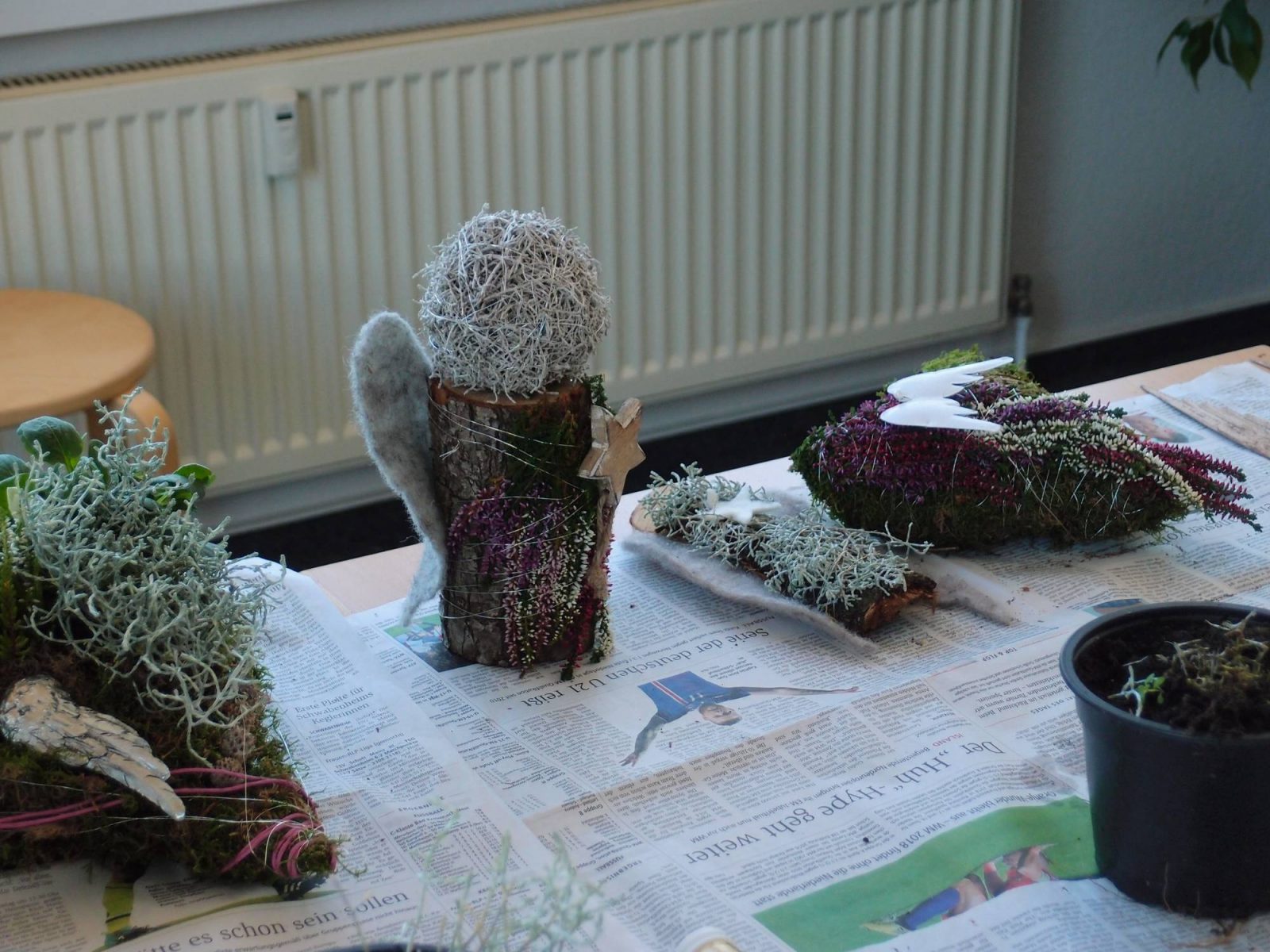 Beim Herbst-Seminar „Der Liebe Gestalt geben“ wurden wunderschöne Schmuckstücke für die Gräber der Kinder gebastelt. Zusammen mit der Gau-Algesheimer Floristin Alisa Vogt fanden sich 10 Teilnehmerinnen und Teilnehmer die in den Räumen der Geschäftsstelle von 13 Uhr bis 16 Uhr sich ganz ihrer Kreativität widmen konnten. Alisa Vogt hatte viele Materialen zusammengestellt, von Moos über kleine Hornveilchen, Erikapflänzchen und verschiedenerlei Dekomaterialen wie Baumrinden und Stoffe. Es war eine wohltuende Atmospähre spürbar. Vielen Dank allen Teilnehmerinnen und Teilnehmer, an Alisa Vogt und natürlich die begleitende Trauerbegleiterin Christa Steigner für diesen Nachmittag.