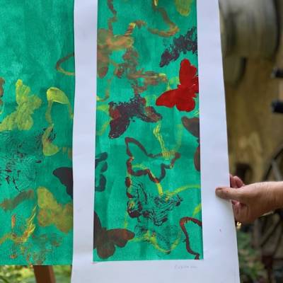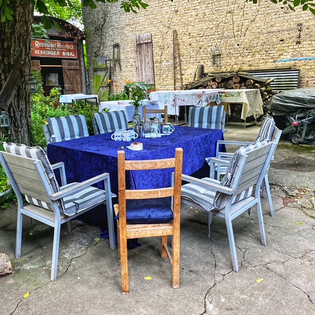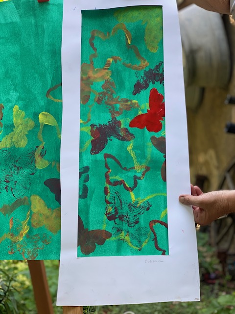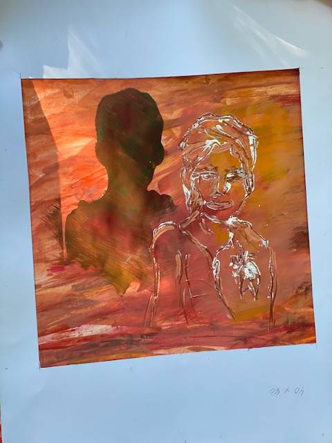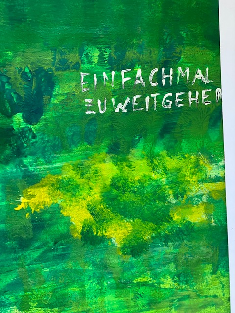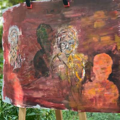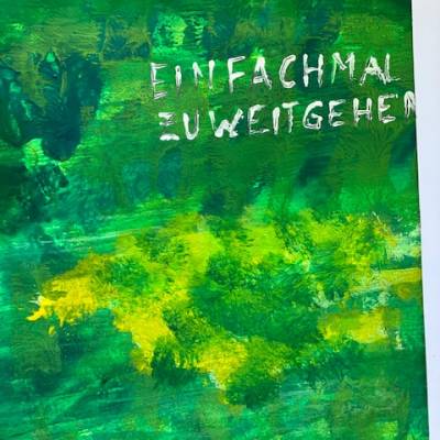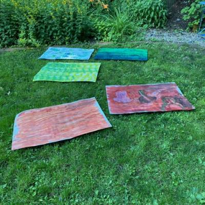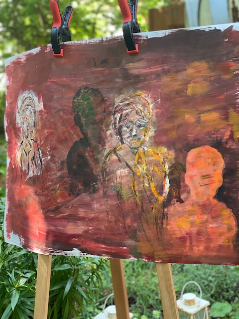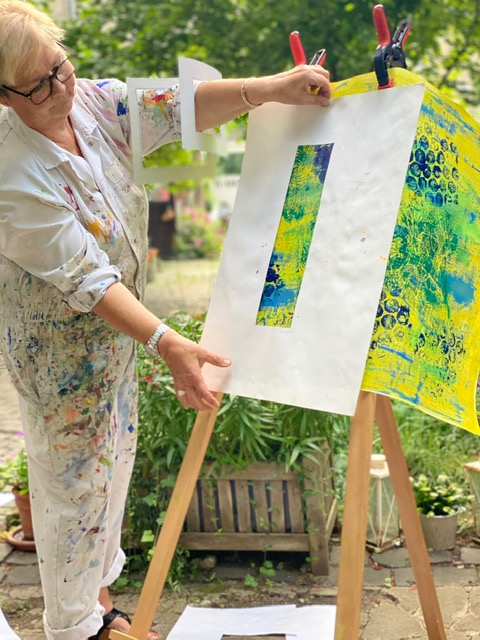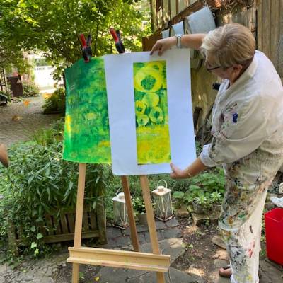 „Glück hatten wir mit dem Wetter und so konnten sich in schöner Umgebung, an der frischen Luft, die Teilnehmer:innen ausprobieren und einen Zugang zur Kunst erfahren. Alle hatten die gleichen Informationen, über Farben, Techniken, Herangehensweisen und dennoch sind ganz unterschiedliche – die genau passenden Werke – für Jeden entstanden. Vorerfahrung ist keine nötig. Ein klein wenig Mut und keine Furcht vor Farbe schon. Zeit für Gespräche ist selbstverständlich, falls gewünscht, vorhanden.“