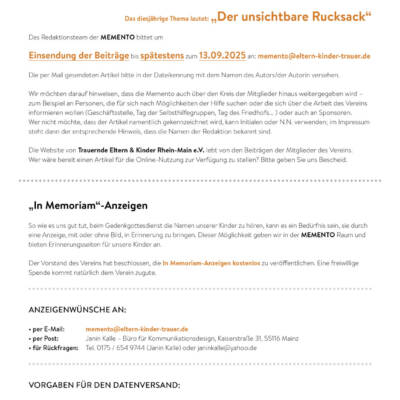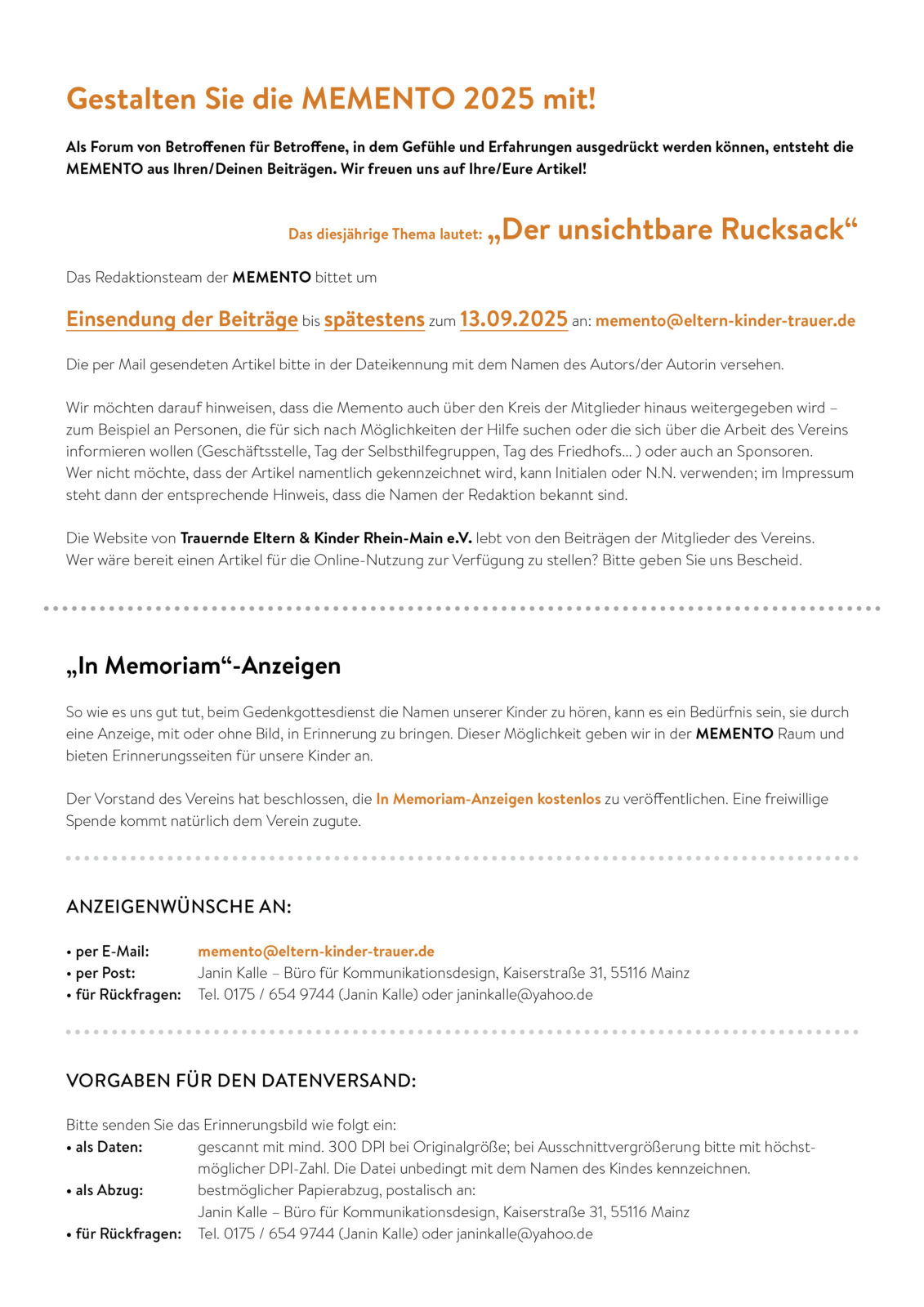 Anzeigenbuchung: Kontakt: memento(at)eltern-kinder-trauer.de