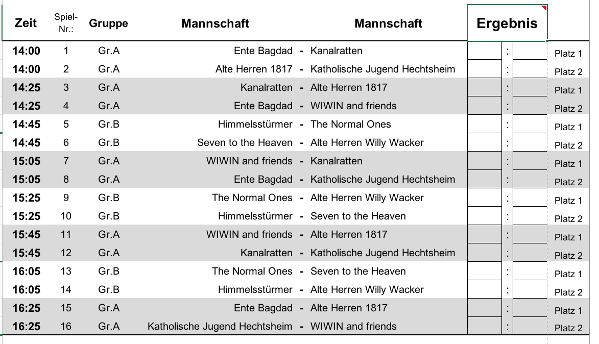 Nur noch wenige Tage, dann findet unser 1. Benefiz-Fußball-Turnier statt. Der Spielpan steht fest, es gibt zwei Gruppen und die Spiele finden parallel auf zwei Plätzen statt. Wir werden aufgrund der Wetterbedinungen mehr Pausen einplanen, so dass sich die Spielzeiten verändern werden.